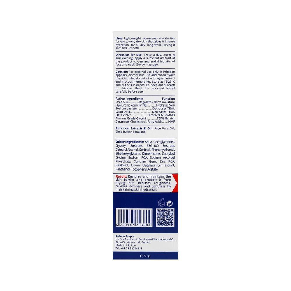 کرم مرطوب کننده اوره 5% آردن آتوپیا یک محصول تخصصی برای پوستهای خشک و خیلی خشک است که با ترکیب اوره 5 درصد و اسید هیالورونیک 1 درصد، رطوبت عمیق و طولانیمدت را به پوست تحویل میدهد. این کرم مرطوب کننده صورت با بازسازی سد هیدرولیپیدیک پوست، علائم خشکی مانند خارش، احساس کشیدگی و سوزش را کاهش میدهد. بافت سبک و غیرچرب آن جذب سریع دارد و برای استفاده روزانه مناسب است.