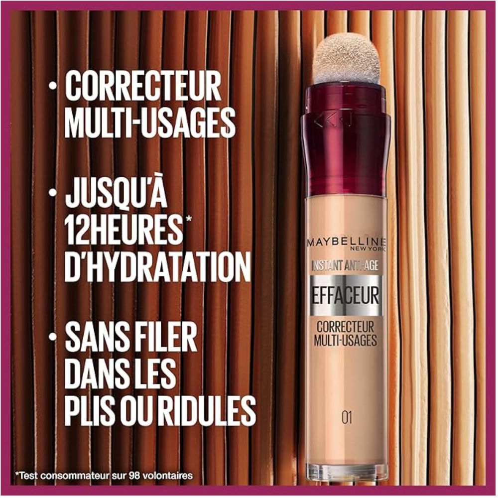 کانسیلر پددار میبلین Instant Age Rewind یک کانسیلر چندمنظوره با اپلیکاتور اسفنجی است که همزمان پوشانندگی، آبرسانی و اصلاح رنگ را برای ناحیه زیر چشم و سایر نقاط صورت فراهم میکند. فرمول آن بر پایه سیلیکون و گلیسیرین طراحی شده و حاوی پپتیدها، عصاره گوجی بری و ترکیبات آنتیاکسیدان برای کمک به کاهش ظاهر تیرگی و خطوط ریز اطراف چشم است.