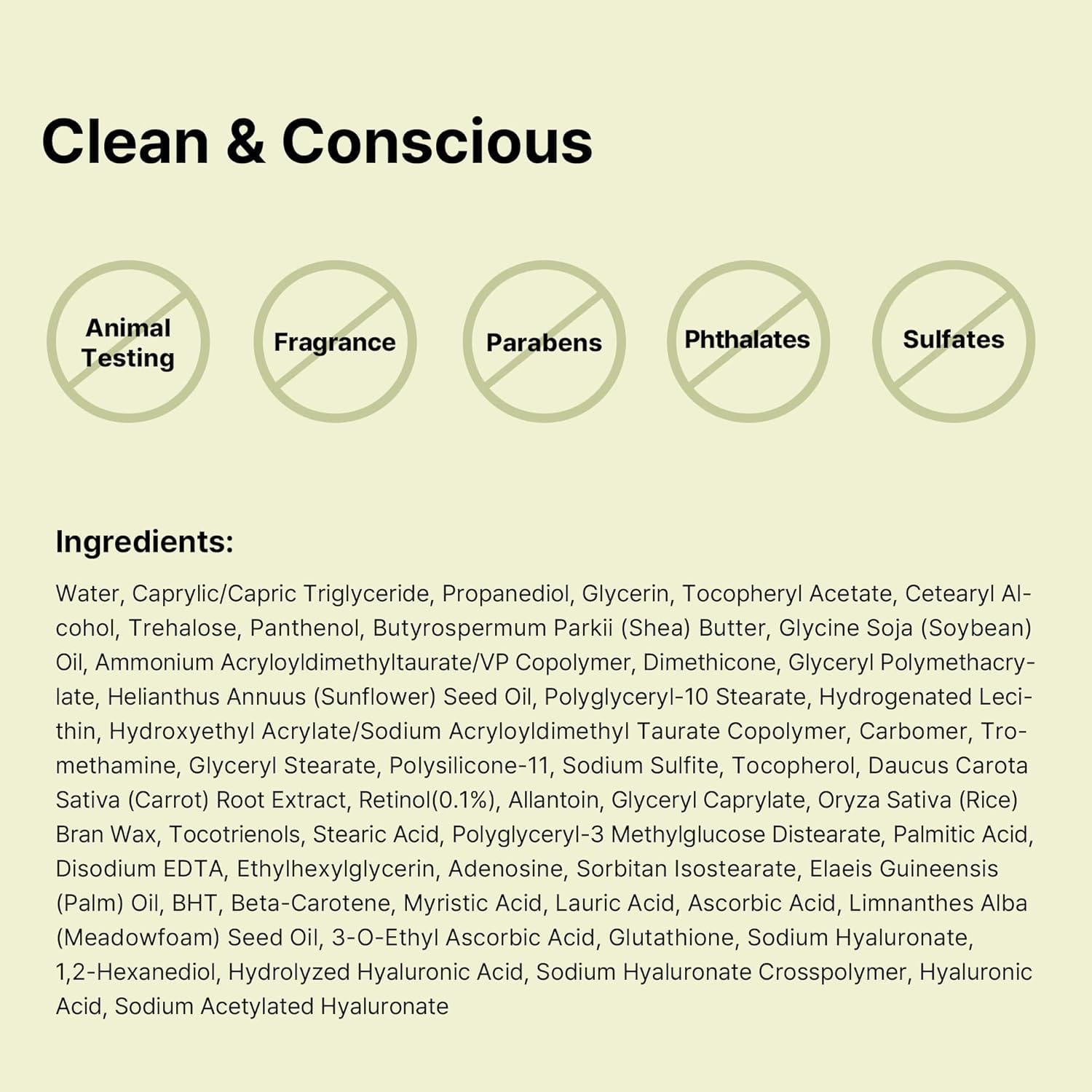 Water, Caprylic/Capric Triglyceride, Propanediol, Glycerin, Tocopheryl Acetate, Cetearyl Alcohol, Trehalose, Panthenol, Butyrospermum Parkii (Shea) Butter, Glycine Soja (Soybean) Oil, Ammonium Acryloyldimethyltaurate/VP Copolymer, Dimethicone, Glyceryl Polymethacrylate, Helianthus Annuus (Sunflower) Seed Oil, Polyglyceryl-6 Stearate, Hydrogenated Lecithin, Hydroxyethyl Acrylate/Sodium Acryloyldimethyl Taurate Copolymer, Carbomer, Tromethamine, Glyceryl Stearate, Polysilicone-11, Sodium Sulfite, Tocopherol, Daucus Carota Sativa (Carrot) Root Extract, Retinol, Allantoin, Glyceryl Caprylate, Oryza Sativa (Rice) Bran Wax, Tocotrienols, Stearic Acid, Polyglyceryl-3 Methylglucose Distearate, Palmitic Acid, Disodium EDTA, Ethylhexylglycerin, Adenosine, Sorbitan Isostearate, Elaeis Guineensis (Palm) Oil, BHT, Beta-Carotene, Myristic Acid, Lauric Acid, Ascorbic Acid, Limnanthes Alba (Meadowfoam) Seed Oil, 3-O-Ethyl Ascorbic Acid, Glutathione, Sodium Hyaluronate, 1,2-Hexanediol, Hydrolyzed Hyaluronic Acid, Sodium Hyaluronate Crosspolymer, Hyaluronic Acid, Sodium Acetylated Hyaluronate