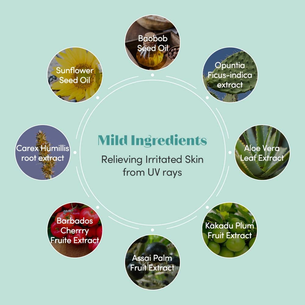 Water/​Aqua/​Eau, Cyclopentasiloxane, Zinc Oxide (Nano), Alcohol, Dipropylene Glycol, Dicaprylyl Ether, Titanium Dioxide (Nano), PEG-10 Dimethicone, Vinyl Dimethicone/​Methicone Silsesquioxane Crosspolymer, Polymethylsilsesquioxane, Magnesium Sulfate, Methicone, 1,2-Hexanediol, Aluminum Hydroxide, Fragrance/​Parfum, Caprylyl Glycol, Methyl Methacrylate Crosspolymer, Octyldodecanol, Stearic Acid, Dimethicone, Dimethicone/​Vinyl Dimethicone Crosspolymer, Glyceryl Caprylate, Polyglyceryl-6 Polyricinoleate, Propanediol, Butylene Glycol, Microcrystalline Cellulose, Echium Plantagineum Seed Oil, Cellulose Gum, Triethoxycaprylylsilane, Adansonia Digitata Seed Oil, Phenoxyethanol, Centella Asiatica Extract, Viscum Album (Mistletoe) Leaf Extract, Aloe Barbadensis Leaf Juice, Portulaca Oleracea Extract, Helianthus Annuus (Sunflower) Seed Oil, Helianthus Annuus (Sunflower) Seed Oil Unsaponifiables, Cardiospermum Halicacabum Flower/​Leaf/​Vine Extract, Citric Acid, Potassium Sorbate, Ethylhexylglycerin, Sodium Benzoate, Opuntia Ficus-Indica Extract, Tocopherol, Hydrolyzed Hyaluronic Acid, Carex Humillis Root Extract, Malpighia Emarginata (Acerola) Fruit Extract, Euterpe Oleracea Fruit Extract, Terminalia Ferdinandiana Fruit Extract