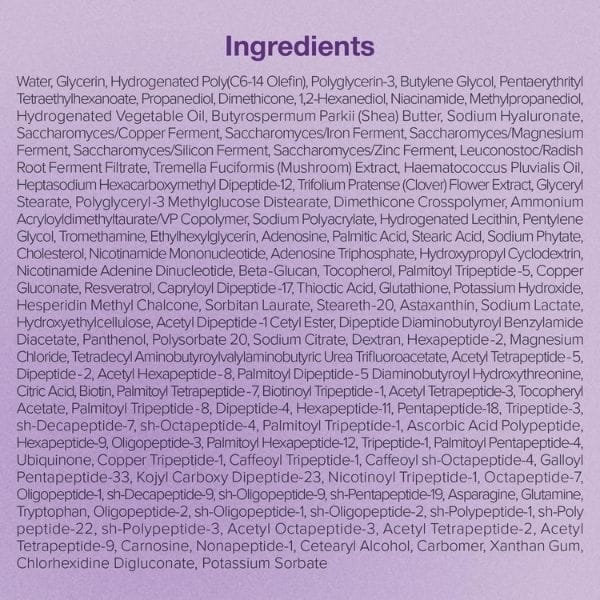 Water, Glycerin, Hydrogenated Poly(C6-14 Olefin), Polyglycerin-3, Butylene Glycol, Pentaerythrityl Tetraethylhexanoate, Propanediol, Dimethicone, 1,2-Hexanediol, Niacinamide, Methylpropanediol, Cetearyl Alcohol, Glyceryl Stearate, Hydrogenated Vegetable Oil, Polyglyceryl-3 Methylglucose Distearate, Butyrospermum Parkii (Shea) Butter, Dimethicone Crosspolymer, Ammonium Acryloyldimethyltaurate/VP Copolymer, Sodium Polyacrylate, Hydrogenated Lecithin, Carbomer, Xanthan Gum, Pentylene Glycol, Tromethamine, Ethylhexylglycerin, Adenosine, Palmitic Acid, Stearic Acid, Sodium Phytate, Cholesterol, Sodium Hyaluronate, Adenosine Triphosphate, Hydroxypropyl Cyclodextrin, Nicotinamide Adenine Dinucleotide, Beta-Glucan, Tocopherol, Palmitoyl Tripeptide-5, Copper Gluconate, Saccharomyces/Copper Ferment, Saccharomyces/Iron Ferment, Saccharomyces/Magnesium Ferment, Saccharomyces/Silicon Ferment, Saccharomyces/Zinc Ferment, Capryloyl Dipeptide-17, Thioctic Acid, Leuconostoc/Radish Root Ferment Filtrate, Glutathione, Tremella Fuciformis (Mushroom) Extract, Haematococcus Pluvialis Oil, Potassium Hydroxide, Resveratrol, Hesperidin Methyl Chalcone, Sorbitan Laurate, Steareth-20, Astaxanthin, Sodium Lactate, Hydroxyethylcellulose, Acetyl Dipeptide-1 Cetyl Ester, Dipeptide Diaminobutyroyl Benzylamide Diacetate, Heptasodium Hexacarboxymethyl Dipeptide-12, Panthenol, Polysorbate 20, Sodium Citrate, Chlorhexidine Digluconate, Dextran, Hexapeptide-2, Magnesium Chloride, Tetradecyl Aminobutyroylvalylaminobutyric Urea Trifluoroacetate, Acetyl Tetrapeptide-5, Dipeptide-2, Potassium Sorbate, Acetyl Hexapeptide-8, Palmitoyl Dipeptide-5 Diaminobutyroyl Hydroxythreonine, Citric Acid, Biotin, Palmitoyl Tetrapeptide-7, Biotinoyl Tripeptide-1, Acetyl Tetrapeptide-3, Trifolium Pratense (Clover) Flower Extract, Tocopheryl Acetate, Palmitoyl Tripeptide-8, Dipeptide-4, Hexapeptide-11, Pentapeptide-18, Tripeptide-3, SH-Decapeptide-7, SH-Octapeptide-4, Palmitoyl Tripeptide-1, Ascorbic Acid Polypeptide, Hexapeptide-9, Oligopeptide-3, Palmitoyl Hexapeptide-12, Tripeptide-1, Palmitoyl Pentapeptide-4, Ubiquinone, Copper Tripeptide-1, Caffeoyl Tripeptide-1, Caffeoyl SH-Octapeptide-4, Galloyl Pentapeptide-33, Kojyl Carboxy Dipeptide-23, Nicotinoyl Tripeptide-1, Octapeptide-7, Oligopeptide-1, Sh-Decapeptide-9, SH-Oligopeptide-9, SH-Pentapeptide-19, Asparagine, Glutamine, Tryptophan, Oligopeptide-2, SH-Oligopeptide-1, SH-Oligopeptide-2, SH-Polypeptide-1, Sh-Polypeptide-22, SH-Polypeptide-3, Acetyl Octapeptide-3, Acetyl Tetrapeptide-2, Acetyl Tetrapeptide-9, Carnosine, Nonapeptide-1