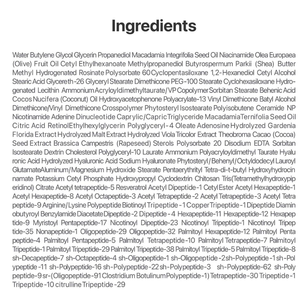Water, Butylene Glycol, Glycerin, Propanediol, Macadamia Ternifolia Seed Oil, Niacinamide, Olea Europaea (Olive) Fruit Oil, Cetyl Ethylhexanoate, Methylpropanediol, Butyrospermum Parkii (Shea) Butter, Cyclopentasiloxane, Caprylyl Glycol, Cetearyl Alcohol, Stearic Acid, Glyceryl Stearate SE, Glyceryl Stearate, Dimethicone, PEG-100 Stearate, Cyclohexasiloxane, Hydrogenated Lecithin, Acrylates/C10-30 Alkyl Acrylate Crosspolymer, Sorbitan Stearate, Cocos Nucifera (Coconut) Oil, Polyacrylate-13, Behenyl Alcohol, Dimethicone/Vinyl Dimethicone Crosspolymer, Polyisobutene, Ceramide NP, Caprylic/Capric Triglyceride, Macadamia Ternifolia Seed Oil, Citric Acid, Retinol, Ethylhexylglycerin, Polyglyceryl-4 Oleate, Adenosine, Hydrolyzed Gardenia Florida Extract, Hydrolyzed Malt Extract, Hydrolyzed Viola Tricolor Extract, Theobroma Cacao Seed Extract, Brassica Campestris Sterols, Polysorbate 20, Disodium EDTA, Sorbitan Isostearate, Dextrin, Cholesterol, Polyglyceryl-10 Laurate, Ammonium Polyacryloyldimethyl Taurate, Hyaluronic Acid, Hydrolyzed Hyaluronic Acid, Sodium Hyaluronate, Phytosteryl/Behenyl/Octyldodecyl Lauroyl Glutamate, Aluminum/Magnesium Hydroxide Stearate, Pentaerythrityl Tetra-Di-T-Butyl Hydroxyhydrocinnamate, Potassium Cetyl Phosphate, Hydroxypropyl Cyclodextrin, Chitosan, Tromethamine, Acetyl Tributyl Citrate, Tetrapeptide-5, Resveratrol, Acetyl Dipeptide-1 Cetyl Ester, Acetyl Hexapeptide-1, Acetyl Hexapeptide-8, Acetyl Octapeptide-3, Acetyl Tetrapeptide-2, Acetyl Tetrapeptide-3, Acetyl Tetrapeptide-9, Biotinoyl Tripeptide-1, Copper Tripeptide-1, Dipeptide Diaminobutyroyl Benzylamide Diacetate, Dipeptide-2, Hexapeptide-11, Hexapeptide-9, Nonapeptide-1, Oligopeptide-1, Palmitoyl Dipeptide-10, Palmitoyl Hexapeptide-12, Palmitoyl Pentapeptide-4, Palmitoyl Tetrapeptide-7, Palmitoyl Tripeptide-1, Palmitoyl Tripeptide-5, Pentapeptide-18, Tripeptide-1, Tripeptide-2, Tripeptide-3, Nicotinamide Adenine Dinucleotide, Acetyl Glutamine, Bacillus/Folic Acid/Soybean Ferment Extract, Sh-Oligopeptide-1, Sh-Oligopeptide-2, Sh-Polypeptide-1, Sh-Polypeptide-11, Sh-Polypeptide-16, Sh-Polypeptide-4, Sh-Polypeptide-9, Calcium Chloride, Magnesium Sulfate, Glutamine, Sodium Phosphate, Arginine, Lysine HCl, Alanine, Histidine HCl, Valine, Leucine, Threonine, Isoleucine, Tryptophan, Phenylalanine, Tyrosine, Glycine, Polysorbate 60, Serine, Cysteine, Cyanocobalamin, Methionine, Proline, Glutathione, Acetyl Cysteine, Disodium Adenosine Triphosphate, Adenine, Guanine, Thymine, Inositol, Niacin, Niacinamide, Pyridoxine HCl, Biotin, Calcium Pantothenate, Riboflavin, Sodium Tocopheryl Phosphate, Thiamine HCl, Folic Acid