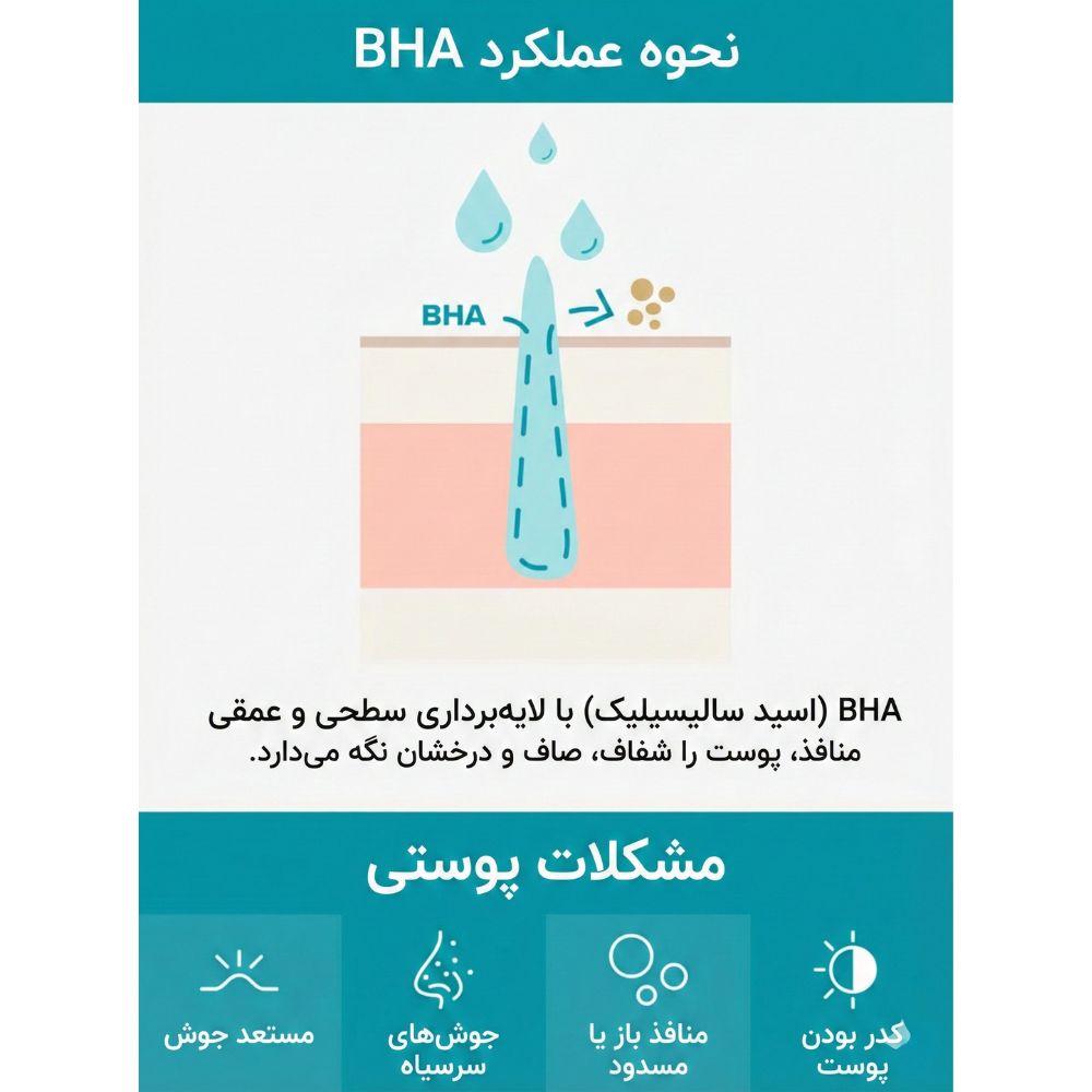 اسید سالیسیلیک (Salicylic Acid – ۲٪): این بتا هیدروکسی اسید (BHA) به دلیل محلول بودن در چربی، توانایی نفوذ عمیق به درون منافذ را دارد و با حل کردن سبوم و سلولهای مرده پوستی، منافذ را پاکسازی میکند. برخلاف آلفا هیدروکسی اسیدها (AHA) که تنها سطح پوست را لایهبرداری میکنند، اسید سالیسیلیک میتواند به داخل منافذ چرب نفوذ کرده و جوشهای سرسیاه، جوشهای سفید و آکنه را کاهش دهد. غلظت ۲ درصدی آن، سطح درمانی مؤثر بدون نیاز به نسخه پزشک است.