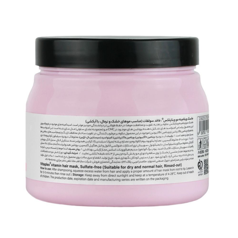 ماسک ویتامینه مو ویتاپلکس، فاقد سولفات مخصوص موهای خشک و نرمال، با آبکشی